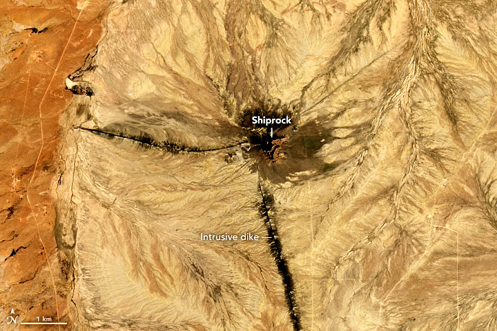 Protruding from the New Mexican desert is the extinct, volcanic spire of Shiprock, a lava 'plug' that hardened in place and the volcanic sides eroded away. It was compared to a Martian desert landscape photographed by a satellite, the Mars Reconnaissance Orbiter with its HiRise camera. Early volcanic activity on Mars created similar razor-like, shapes visible as virtical, triangular walls similar to those seen in New Mexico.