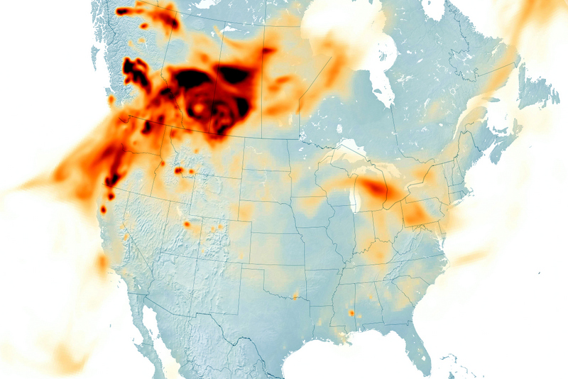 Black carbon smoke over USA & Canadian in Visible and Infrared Light, 8-15-2018 (credit: NASA-NOAA)
