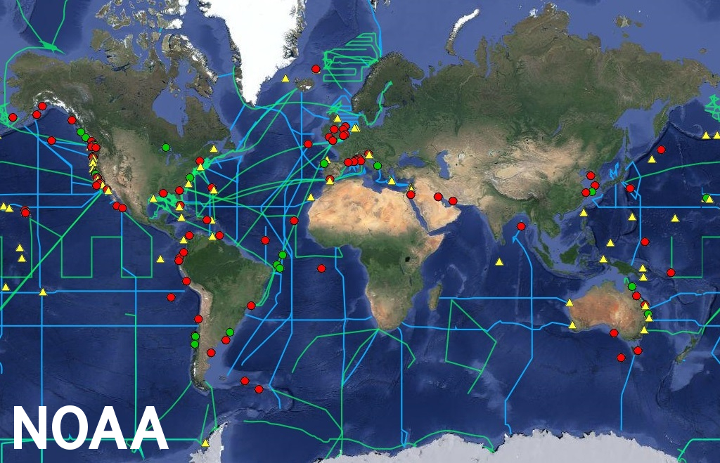 Coastal locations most affected by ocean acidification, red dots (credit: NOAA)