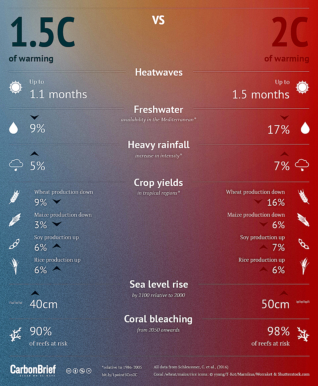 Temperature Comparison of Climate Impacts,1.5C & 2C (credit: Carbon Brief)