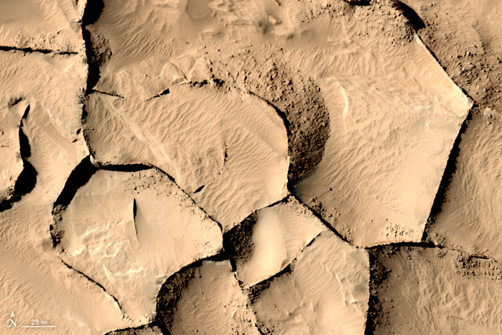 Protruding from the New Mexican desert is the extinct, volcanic spire of Shiprock, a lava 'plug' that hardened in place and the volcanic sides eroded away. It was compared to a Martian desert landscape photographed by a satellite, the Mars Reconnaissance Orbiter with its HiRise camera. Early volcanic activity on Mars created similar razor-like, shapes visible as virtical, triangular walls similar to those seen in New Mexico.
