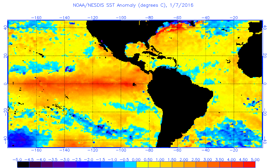 An exceptional level of water vapor is being carried by the atmosphere and high temperatures in the Pacific Ocean has creating surface temperature anomalies. Higher water temperatures allow more moisture to evaporate. The warmer atmosphere carries the moisture which is available to drive extreme storms, rainfall, and flooding events.