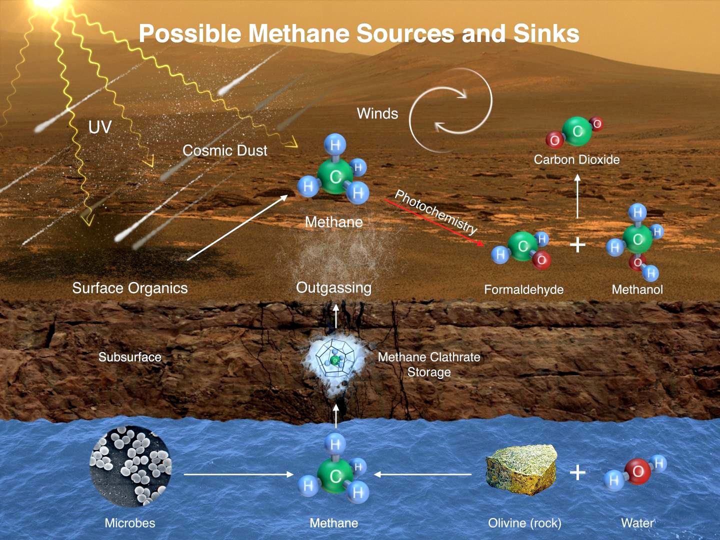 Methane can be produced via either biological or geological processes but on Earth biological sources predominate. The molecule survives in the atmosphere for a relatively short period being degraded by sunlight in a couple hundred years. It is constantly being replenished from biological sources. On Mars, its source is unknown but a NASA graphic illustrates the two possibilities for its presence.