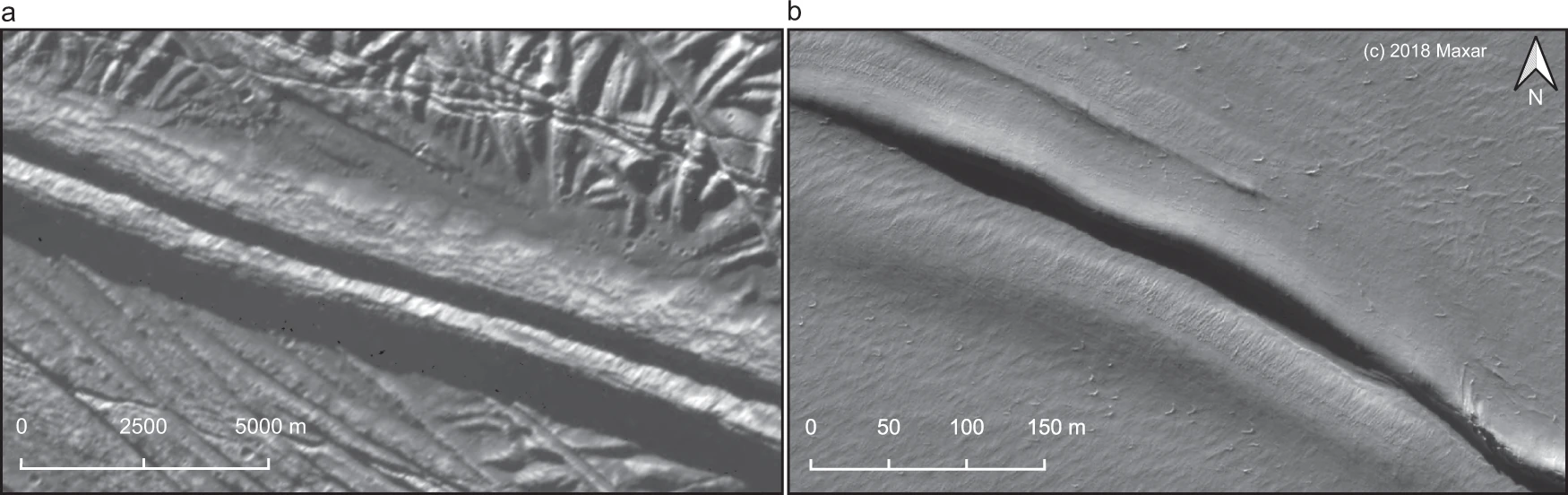 Parallel ice ridges Europa and  Greenland (credit: Galileo mission, Worldview-3 satellite, Nature Communications)